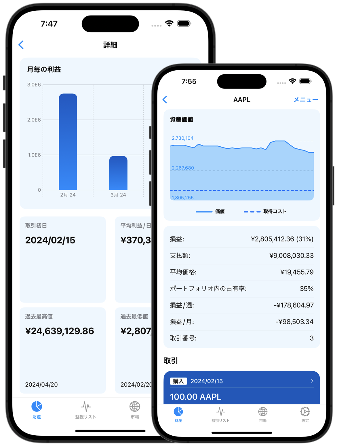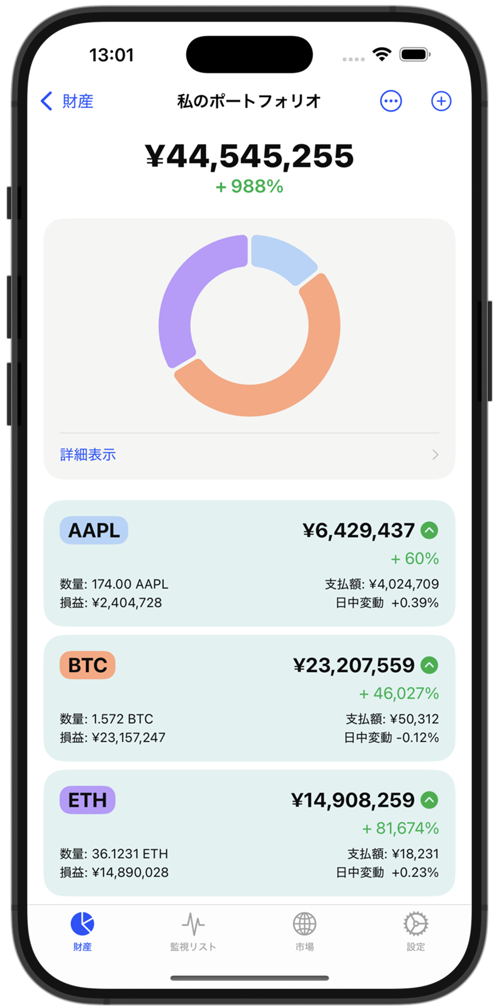 ポートフォリオの統計を確認し、個別資産を追跡、全体の資産を管理。